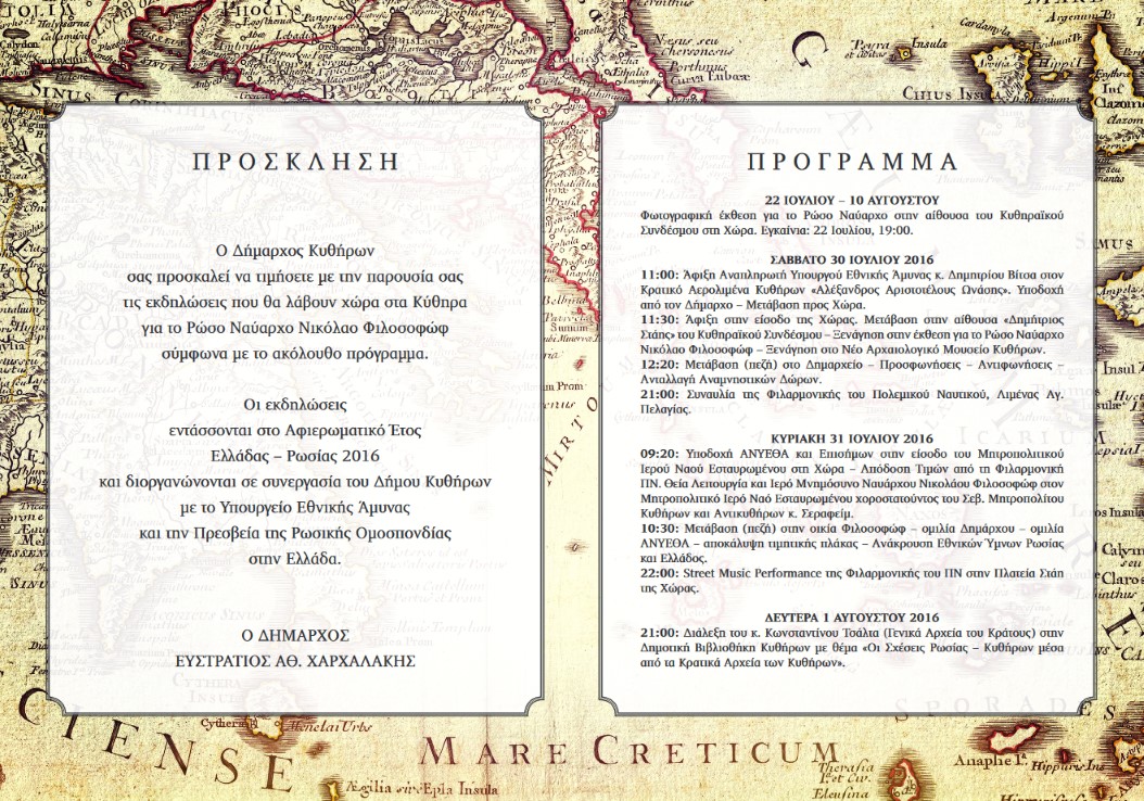 Φωτογραφίες από τη ζωή του Ναυάρχου Νικολάου Φιλοσοφώφ (1867-1946) όπως παρουσιάσθηκε στην έκθεση «Ένας Ναύρχος Φαροφύλακας» που διοργάνωσε η Πολιτιστική Εταιρεία Κυθήρων για λογαριασμό του Δήμου Κυθήρων (Κυθηραϊκός Σύνδεσμος Χώρας, 22/7-10/8 2016), μέρος του 2ου Φεστιβάλ Δήμου Κυθήρων, «Ταξίδι στα Κύθηρα». Το πρωτότυπο υλικό ανήκει στην οικογένεια Φιλοσοφώφ. |